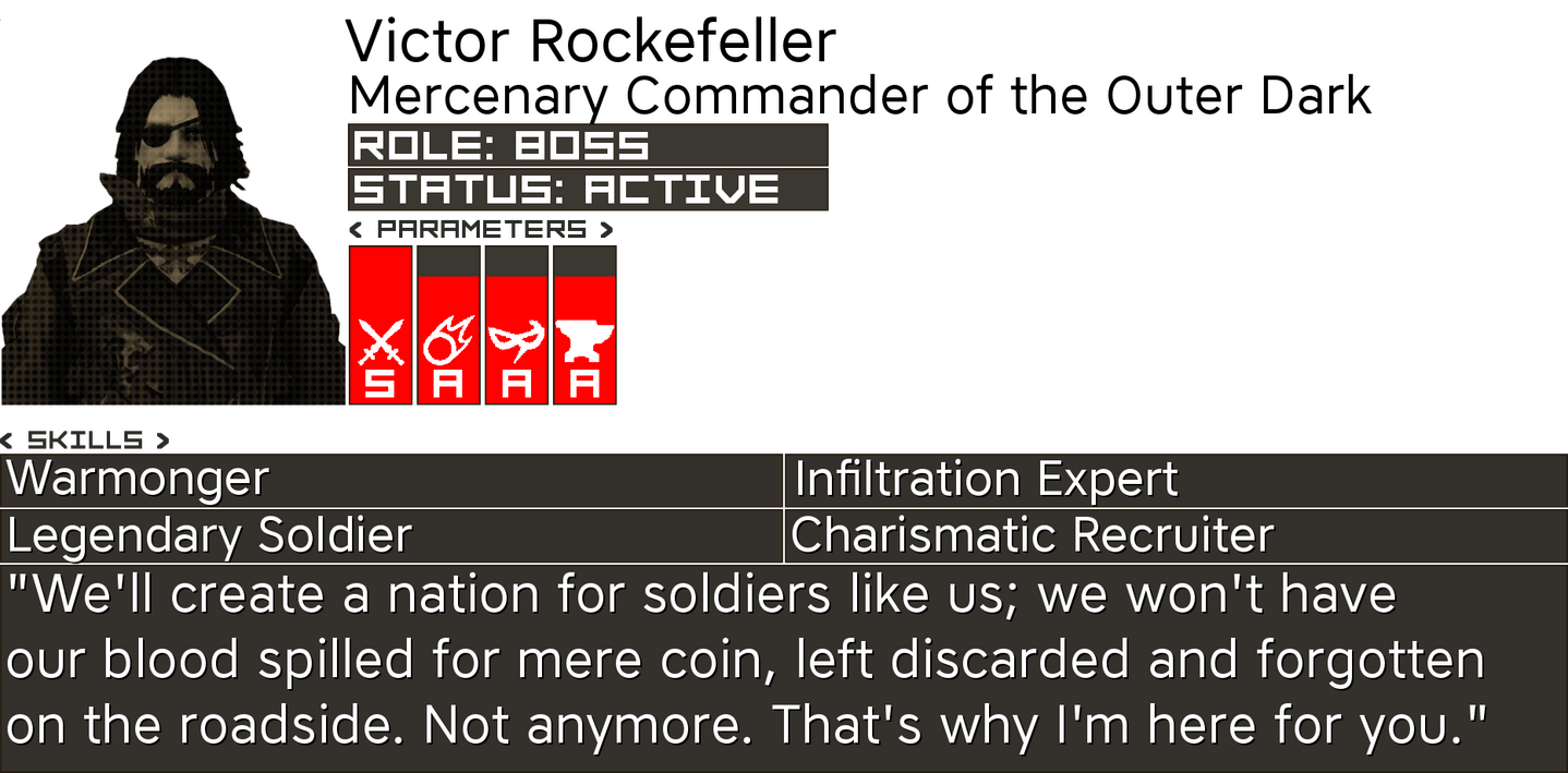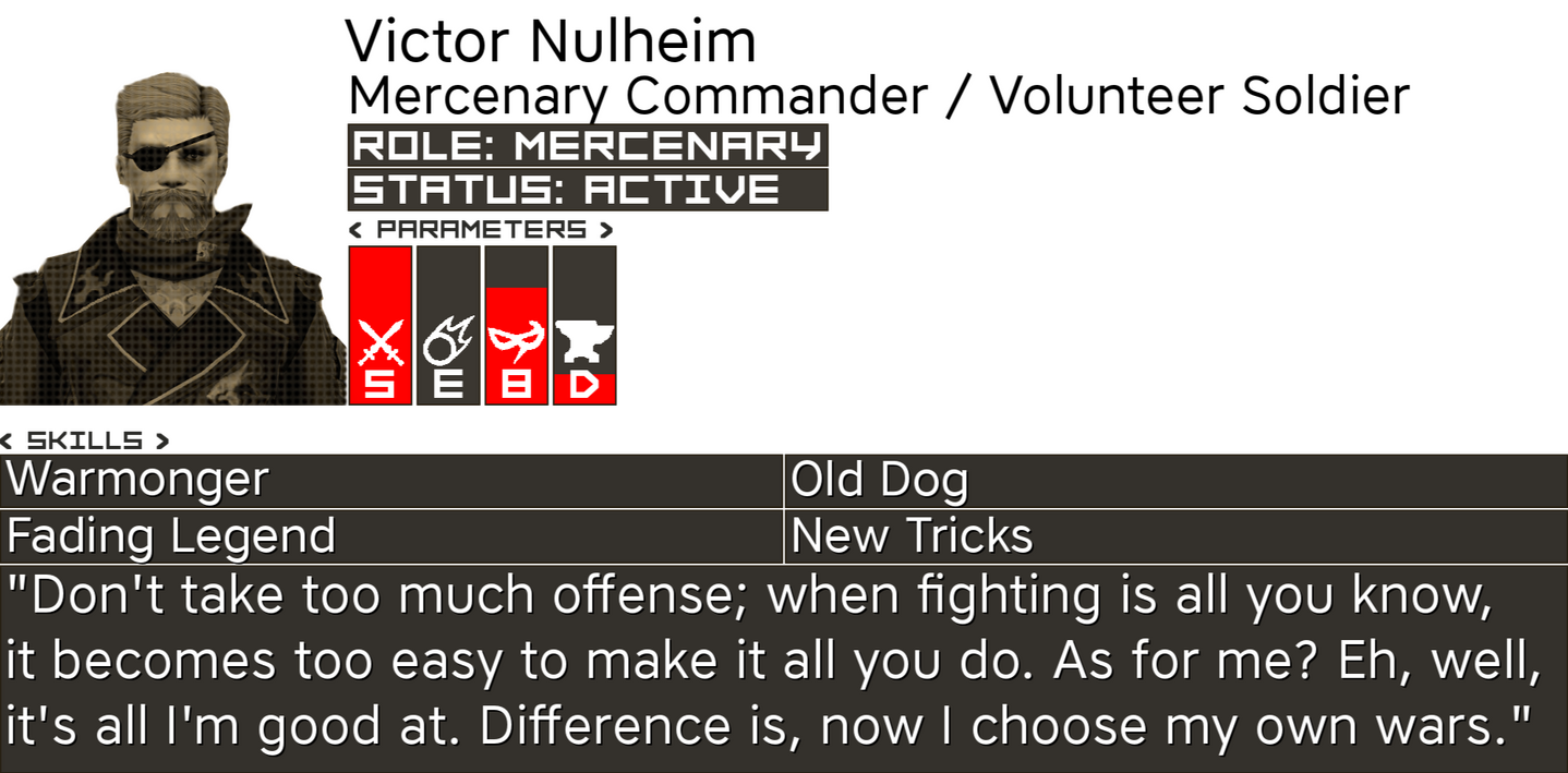 Victor can often be found scouting and observing mercenary groups during their missions from afar. Enterprising mercenary companies may find him at their door, offering a variety of rewards in exchange for successful missions. This would not be so unusual were it not for his insistence on secrecy.