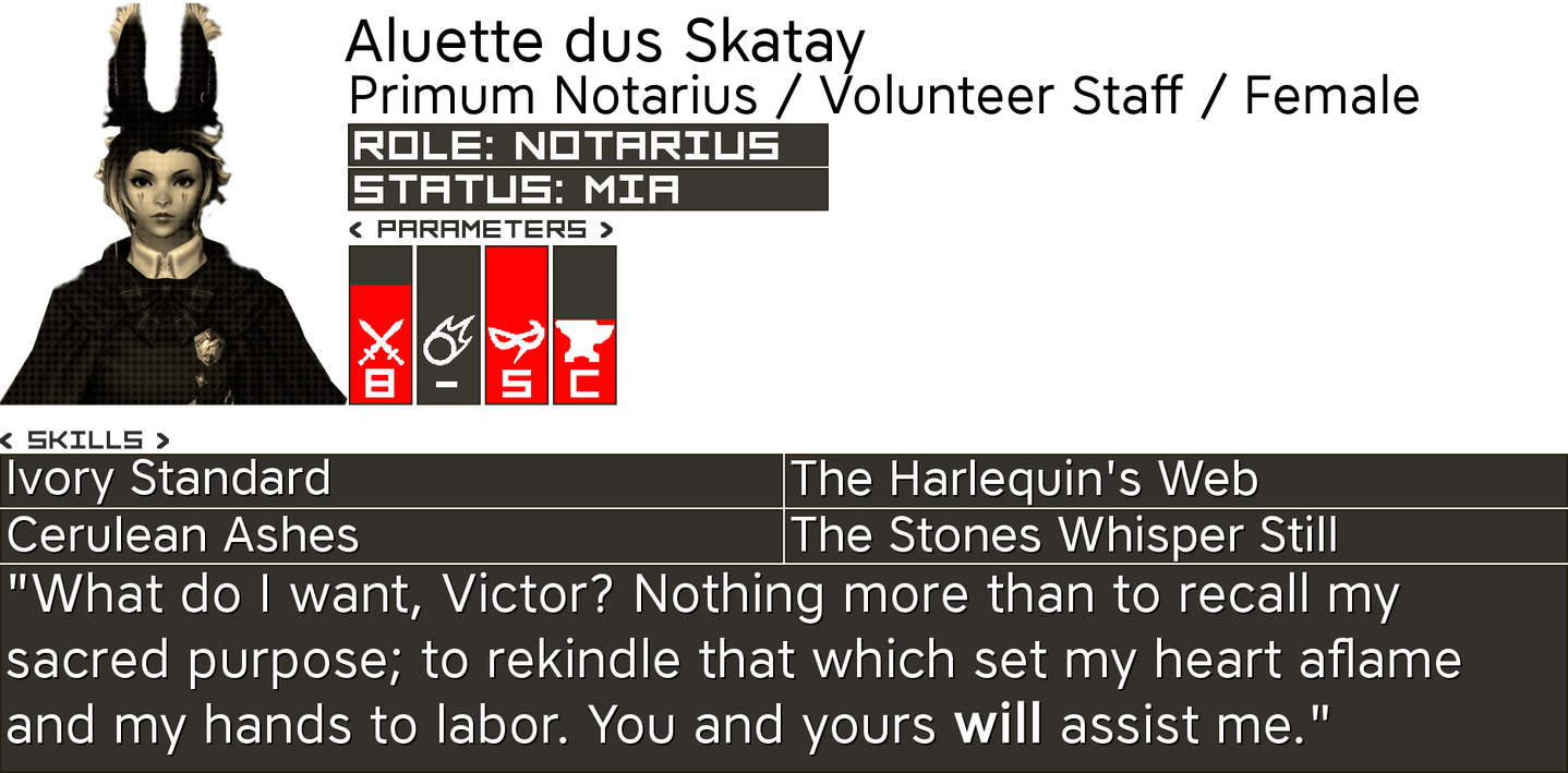 Victor is an active member of the Occulta Speculatores, and devotes most of his efforts to their goals. He is most devoted to it's leader, Aluette dus Skatay, due to their shared history.